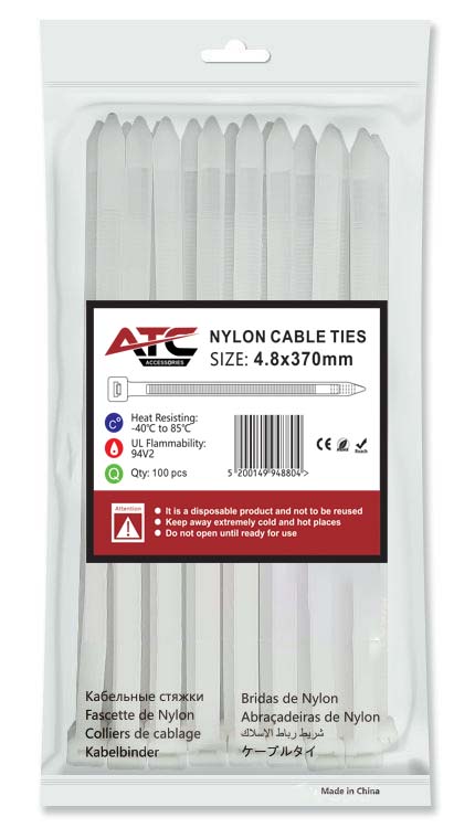 Ανθεκτικά δεματικά από νάιλον, 4.8x370mm, ιδανικά για στερέωση καλωδίων και οργάνωση καλωδίωσης. Διατίθενται σε πρακτική συσκευασία 100 τεμαχίων για εύκολη χρήση και αποθήκευση.